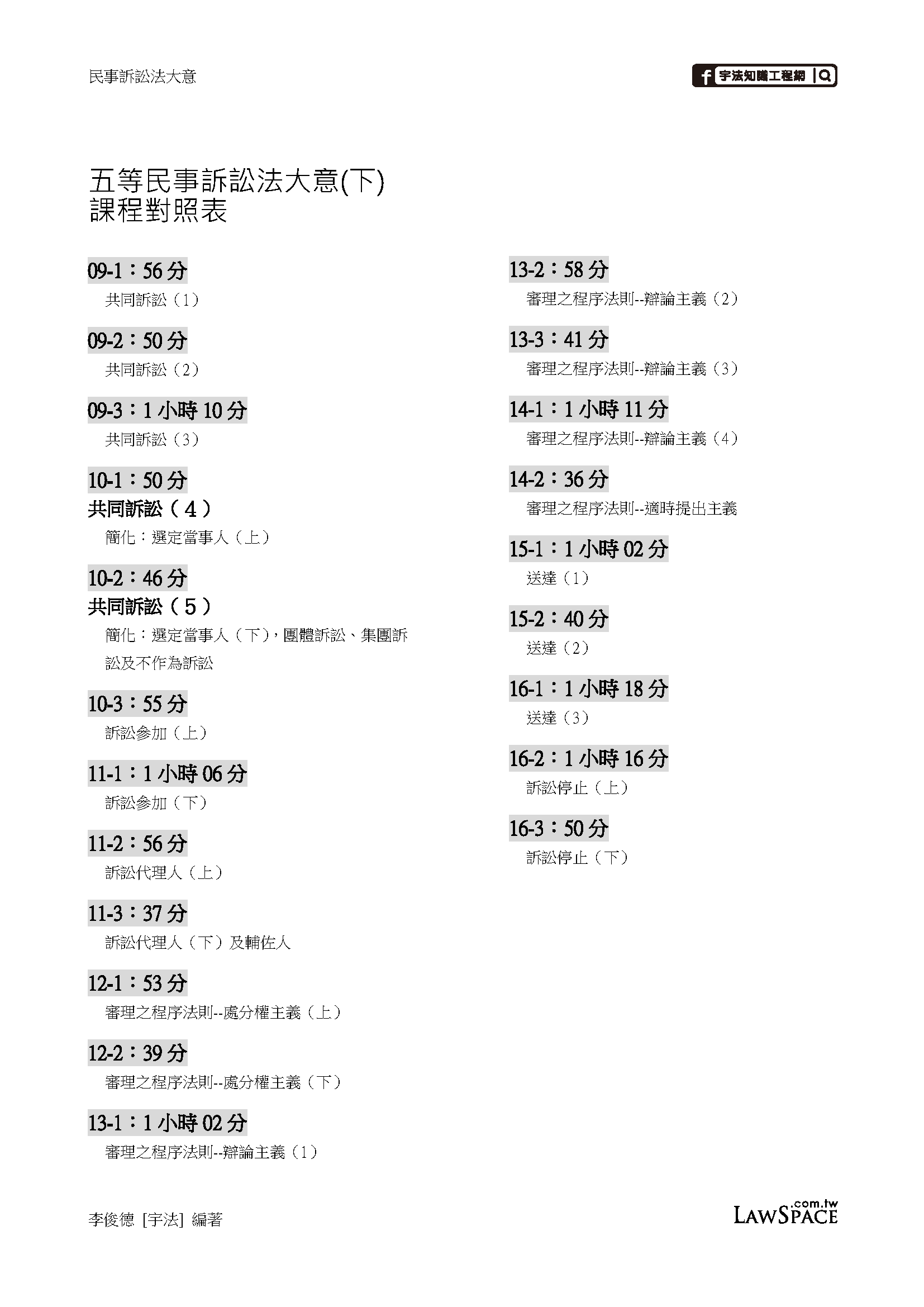 ※課程特色: 一、體系圖表 以體系圖表的方式呈現整體法律規範的內容及其架構,使同學得以掌握所學法科之定位,而不迷茫於龐大民事法律海洋之中。 二、流程貫通 學習程序法,菜鳥最大的困擾就是不會操作,這個課程將會告訴你程序法要如何一步一步的抉擇紛爭解決手段,如果訴訟該如何決定管轄法院、如何起訴、應訴……。 三、重點整理 此部分為課程重點,老師將司法特考、原住民考試及身心障礙考試,許多於考題中一再出現的重要觀念及法條一併附錄於課程中反覆解說,一來讓學員迅速理解各個考試重點內容;二來不必浪費時間的法條內容也可以略過,節省同學準備考試的時間。 四、考題完整 市面上也只有老師完整出版司法特考、原住民考試及身心障礙考試歷屆試題逐題剖析,其餘坊間書籍都是重點收集而不夠全面,老師既然完整解答歷年考題,自能精確掌握考試重點,自不待言。